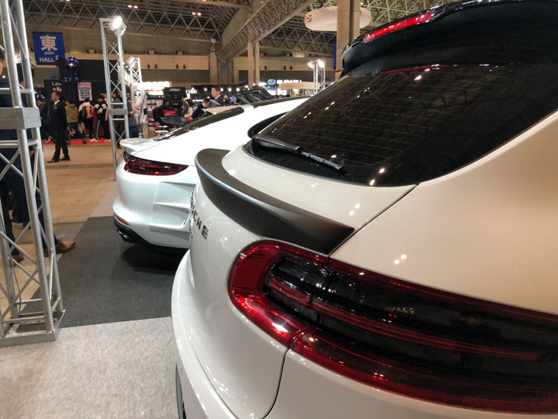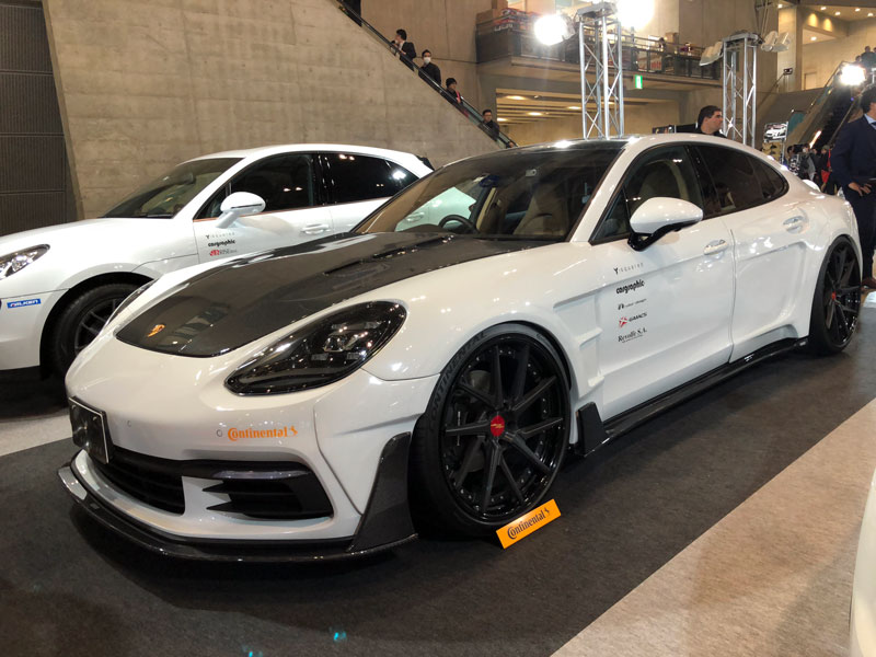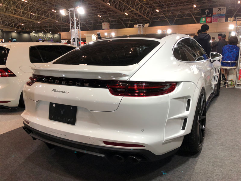 同時に展示されていた新型971パナメーラはY-Squaredのワイドボディキット、カーボンエアロパーツが装着されてます。made in Japanですのでクオリティでワイドボディの仕上がりも良い製品でした。