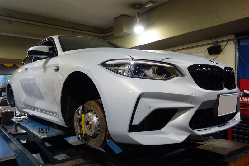 デモカーM2 Competitonを早速サーキットで走らせるために、ブレーキパッド・ブレーキフルードの交換作業を行いました。BMWでサーキットを走る場合ブレーキパッド交換とブレーキフルードは必須作業となります。ノーマルブレーキパッドでは数周であっという間にブレーキはオーバーヒートしてしまい止まらなくなります。恐