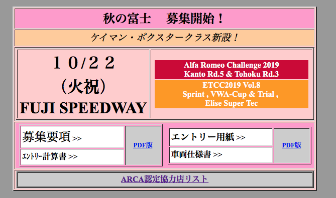 10/22(祝・火)に富士スピードウェイにて開催されるETCCスプリントレース・タイムアタッククラスのエントリーが開始されました。参加をご検討中のお客様はARCA認定店のサンライズブルバードにて事前車検と合わせて参加申し込み受けたまります。
