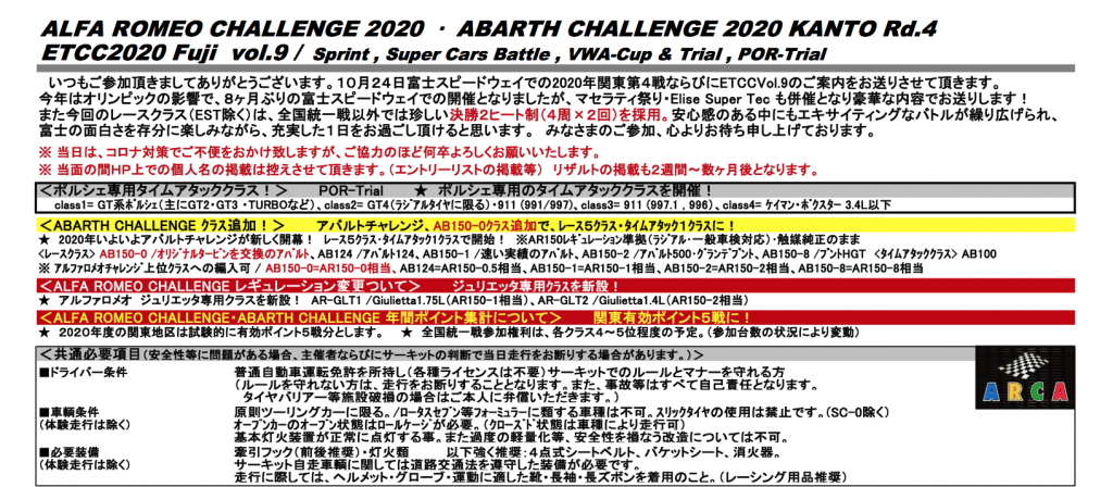 10/24(土)に富士スピードウェイにて開催されるETCCスプリントレース・ポルシェタイムアタッククラス(Porsche-Trial)のエントリーが開始されました。参加をご検討中のお客様はARCA認定店のサンライズブルバードにて事前車検と合わせて参加申し込み受けたまります。タイムアタック以外にもスプリントレースクラス、VWA-CUPや走行会クラスの開催もございます。