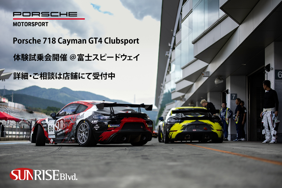 サンライズブルバード では2022年秋よりスタートさせていただきましたレーシングカー レンタルサービスとして「Porsche 718 Cayman GT4 Clubsport」のサーキットにおける車両レンタル走行を行なっております。多くのお客様よりご興味を持っていただきプライベートテストでのレンタル・車両レンタルによるレースイベントへの参戦など参加いただいております。