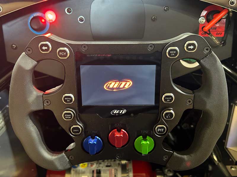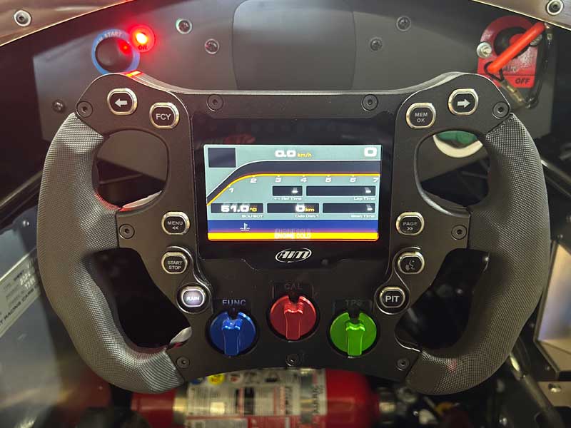 デジタルカラーディスプレイのAIM SW4、拡張機能も多くVITAに限らずパドルシフト付きの車両などにも対応しています。VITAにはヘッドライトやピットスピードリミッターはないため、必要最低限のスイッチ割り当てを行いメンテナンス性とドライバー視認性を優先したメニューを製作いたしました。